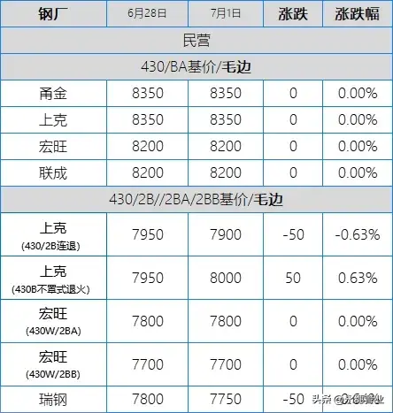 目前市場主流報價:410S熱軋黑皮在6100-6150元/噸;430熱軋黑皮在6700-6800元/噸;太鋼/酒鋼430/2B(毛)在7950-8000元/噸;聯眾430/2BA(毛)在7850元/噸左右;宏旺430/2BA(毛)在7750-7800元/噸;甬金430/BA(毛)在8350元/噸左右;上克430/BA(毛)在8350元/噸左右;宏旺430/BA(毛)在8150-8200元/噸;瑞鋼430/2BA(毛)在7700-7750元/噸,其中期貨價在7800元/噸左右;聯成430/BA(毛)在8200元/噸左右。