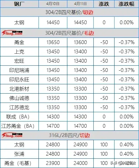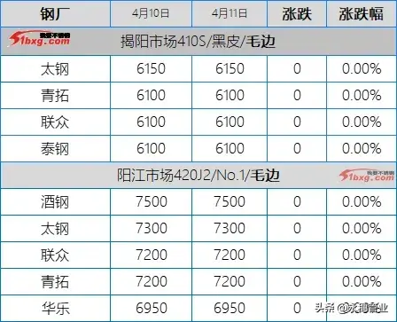 目前市場主流報價:410S熱軋黑皮在6100-6150元/噸,個別在6200元/噸左右;430熱軋黑皮在6700-6800元/噸;太鋼/酒鋼430/2B(毛)在8000-8100元/噸;聯眾430/2BA(毛)在7800-7900元/噸;宏旺430/2BA(毛)在7800-7850元/噸;甬金430/BA(毛)在8450元/噸左右;上克430/BA(毛)在8350元/噸左右;宏旺430/BA(毛)在8200-8250元/噸;瑞鋼430/2BA(毛)在7800元/噸左右;聯成430/BA(毛)在8250元/噸左右。