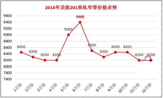 在國內所有生產不銹鋼熱軋窄帶的民營鋼廠當中,主要的鋼種是201。以吳航201熱軋高銅料為例,價格在6月份達到了全年的頂峰,為 9400元/噸。隨后出現下滑,后停留在8200元/噸,為2014年畫上了句號。其中,2014年吳航201熱軋窄帶價格走勢如下圖所示: