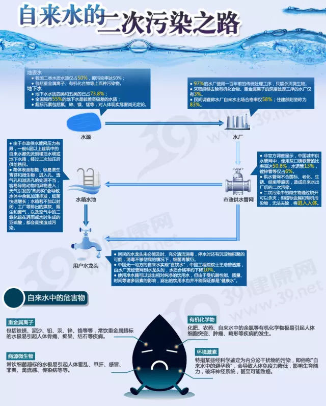 自來水的污染源有很多,其中大的污染源來源于二次供水,如果您是住在高層住宅,每天打開家中的水龍頭時,您是否清楚,水龍頭流出的水其實并不是由自來水公司直接供給,而是通過小區的二次供水設備把設置在樓頂端蓄水池里的水經過加壓后才送到您家的。