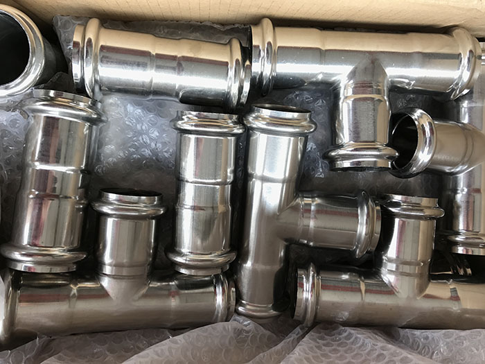 雙卡壓式薄壁不銹鋼管連接是將管材插入管件,利用不銹鋼材料的有效剛性和密封材料的彈性壓縮比原理,同時充分利用承接口的長度在管件承接口的U型槽兩側用專用卡壓工具進行徑向壓接。