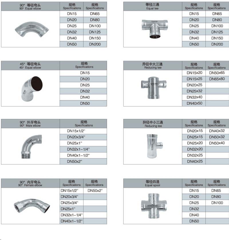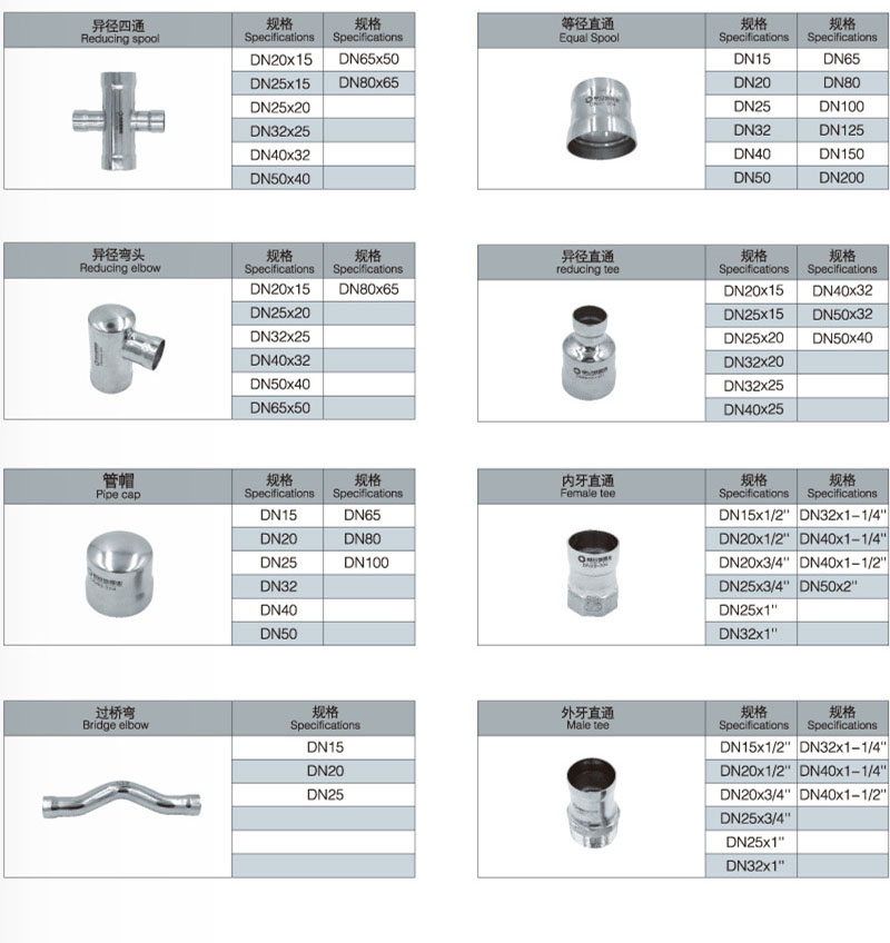 不銹鋼承插焊管件的品種包括:承插焊式45°等徑彎頭,承插焊式90°等徑彎頭,承插焊式180°等徑彎頭,承插焊式內牙彎頭,承插焊式外牙彎頭,承插焊式異徑彎頭,承插焊式外牙三通,承插焊式內牙三通,承插焊式等徑三通,承插焊式異徑中大三通,承插焊式異徑中小三通,承插焊式等徑四通,承插焊式異徑四通,承插焊式等徑直通,承插焊式異徑直通,承插焊式外牙直通,承插焊式內牙直通,承插焊式過橋彎管,承插焊式管帽,承插焊式分水器等。
